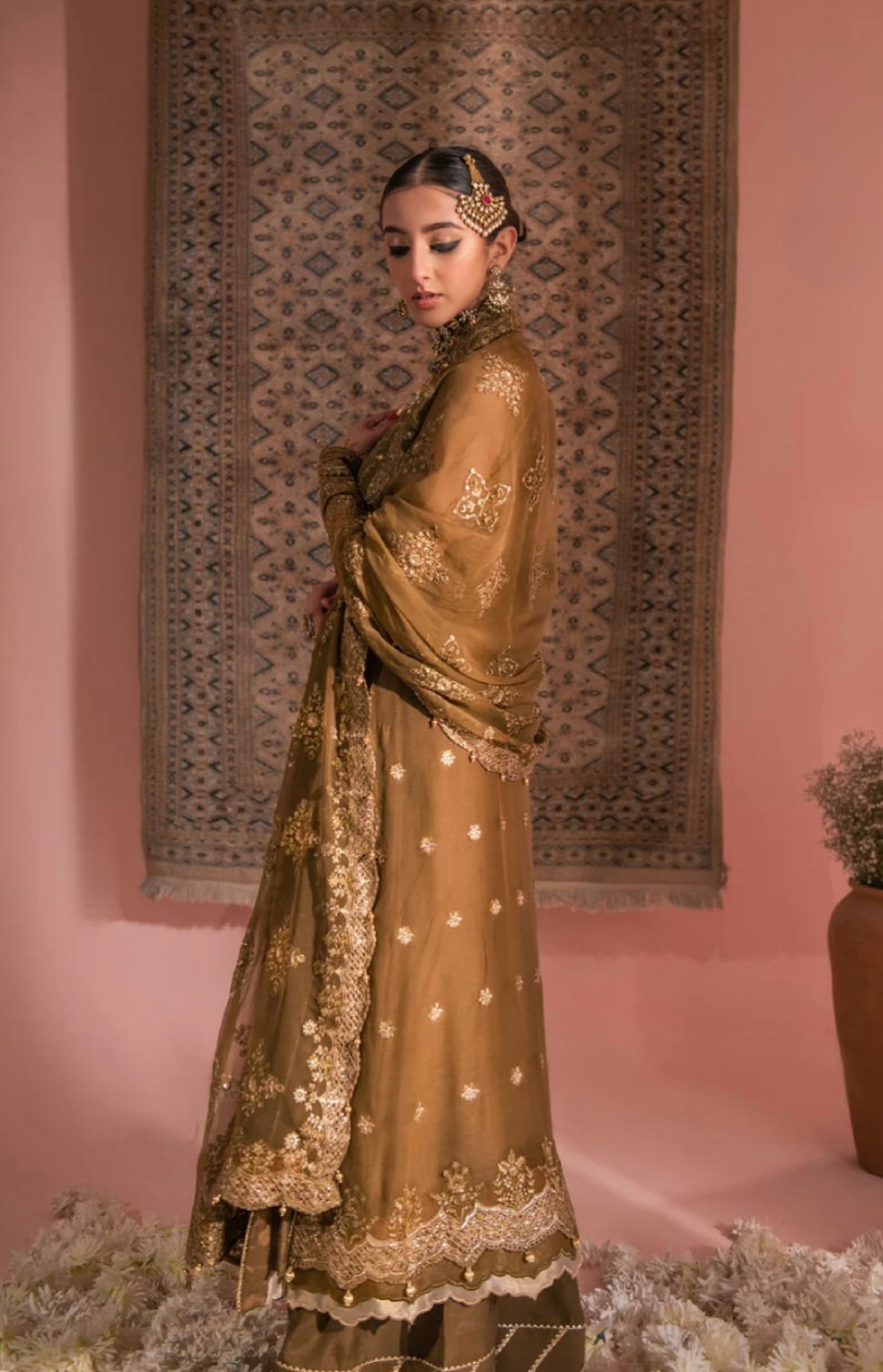 A warm, earthy shade of ochre chiffon sets the base for this traditional yet timeless design. The kameez is composed with with intricate motifs, that are primal in Kashmiri embroideries including blooming florals and other elements of nature. Shimmering sequins and soft scallops on the hemline and dupatta, enhanced the regality of this Look.