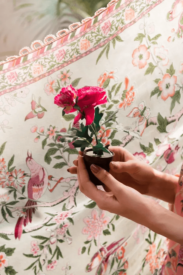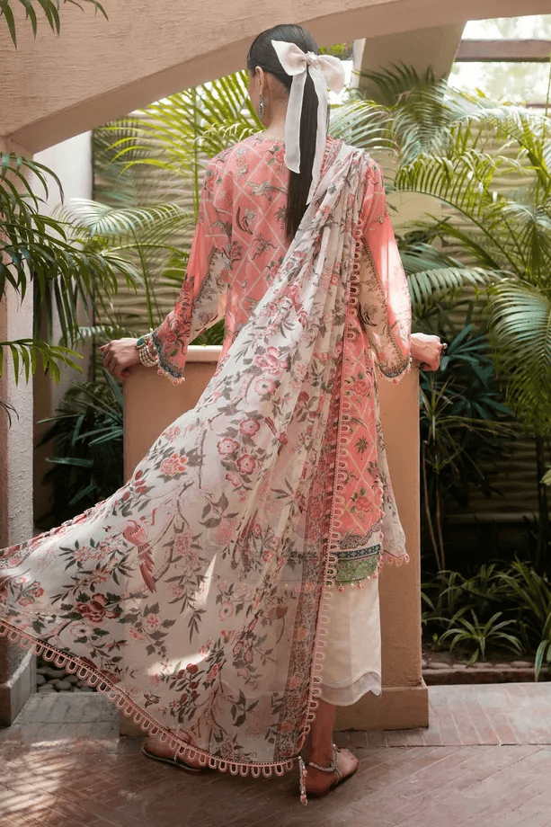 Featuring grids and Chinese scarves motifs, this airy sana safinaz muzlin summer lawn shirt combines a kaleidoscope of colors. Combined with cotton dyed pants and Chinoiserie-inspired digital printed drape, the combination creates a symphony of east and west.