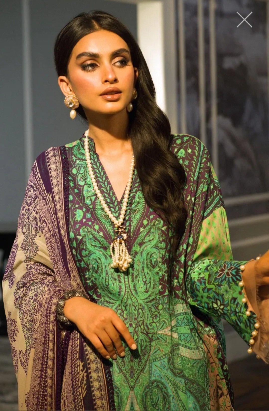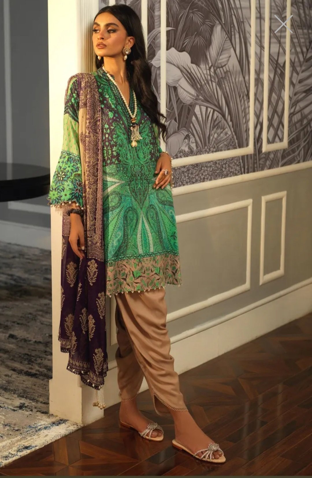 Discover Kashmir again in this gorgeous shawl-inspired style, printed digitally in blues and greens on a deep purple canvas. Complemented with an aesthetic beige and deep purple dupatta along with contrast-colored pants.
